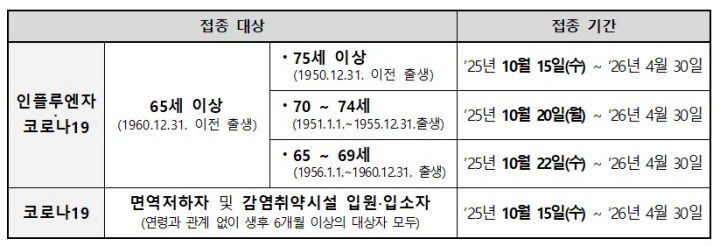 - 75세 이상(1950년 12월 31일 이전 출생): 10월 15일 시작