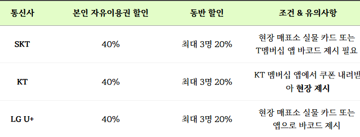 각 통신사 멤버십 앱 또는 실물 카드 제시로 할인 적용.