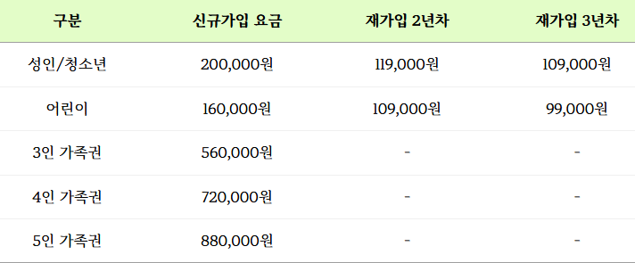 연간회원권 특가 이벤트 연 1~2회 대폭 할인 기존 회원 재가입 시 추가 할인 가능