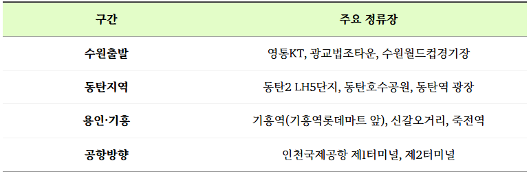 - 운행 지역: 수원 영통 → 동탄 → 기흥 → 죽전 → 인천국제공항