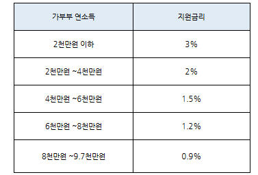- 부부 연소득에 따라 0.9%~3% 금리 지원