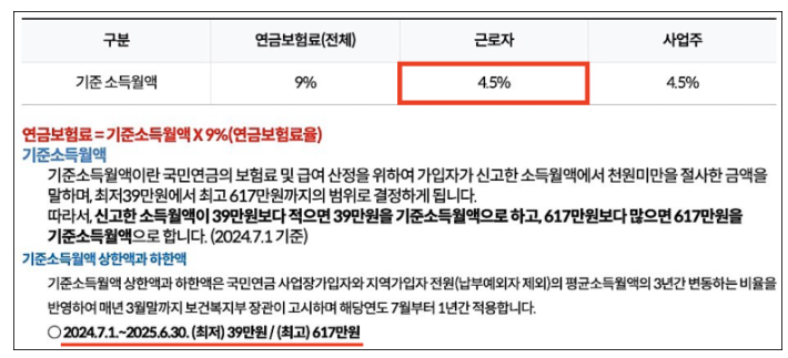 국민연금보험료는 9%로, 사업주와 근로자가 각각 50%씩 부담하여 각 4.5%가 적용됩니다.