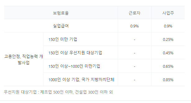고용보험료는 1.8%로, 근로자와 사업주가 각각 0.9%씩 부담하여 실업급여 부담액으로 납부합니다.