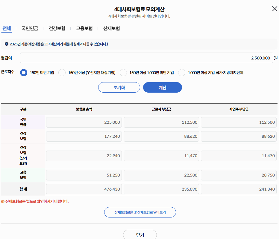 2025년에는 거의 동결된 4대보험 요율로 확인되었으며, 4대보험 계산기를 활용하면 대략적인 금액은 산출됩니다.